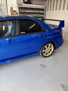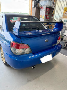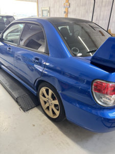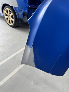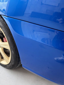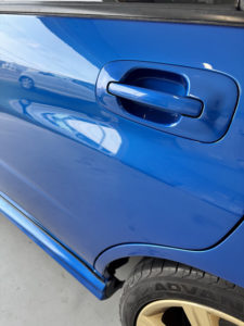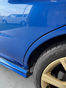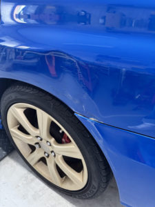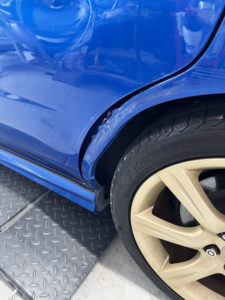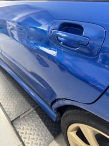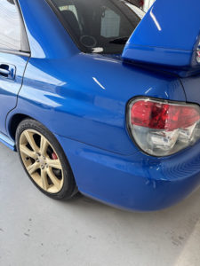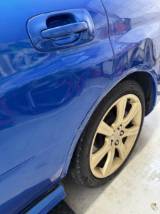 スバル インプレッサの左リヤドア、リヤフェンダーの修理入庫です。