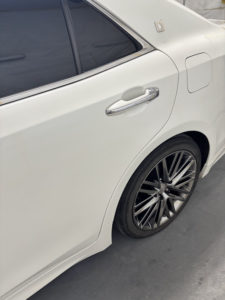 トヨタ クラウンの左リヤドア、リヤフェンダーの修理入庫です。
