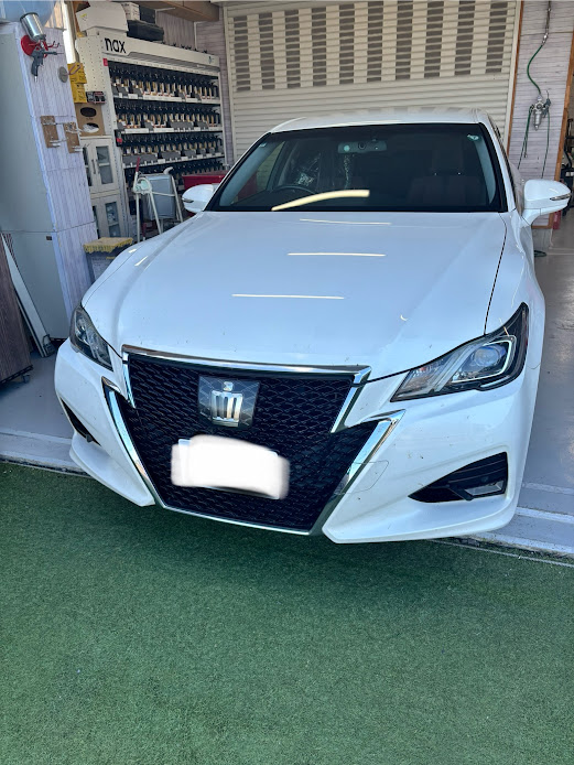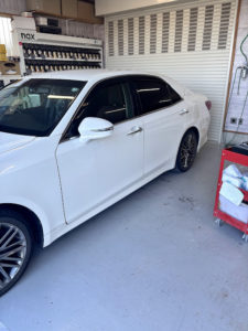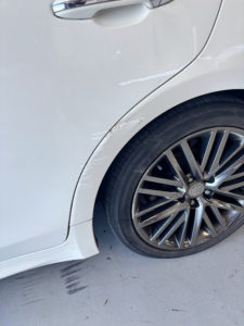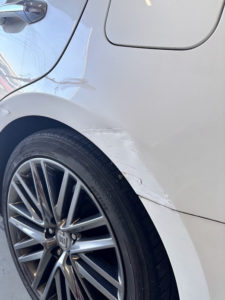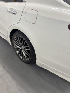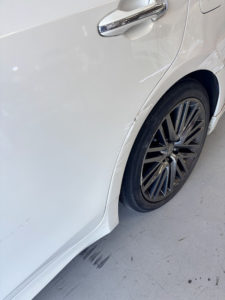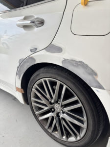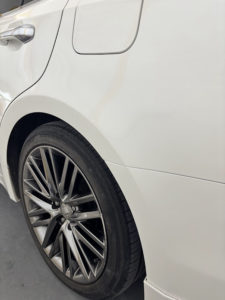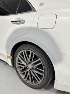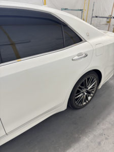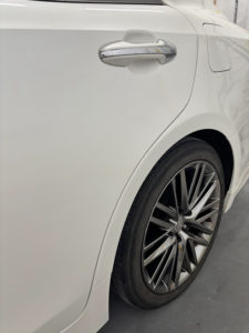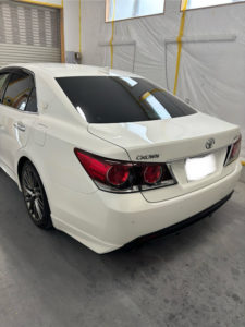 トヨタ クラウンの左リヤドア、リヤフェンダーの修理入庫です。