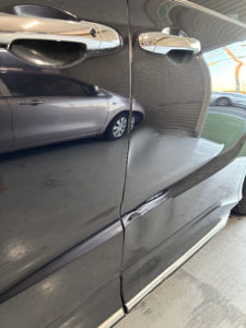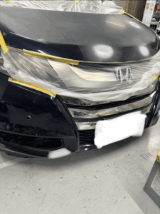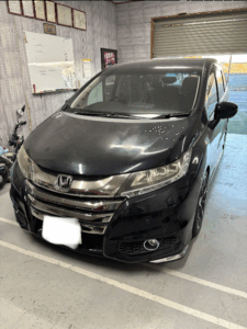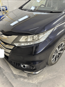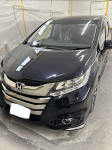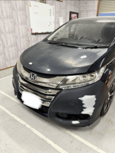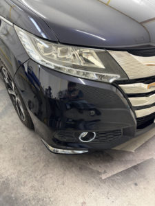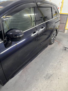 ホンダ オデッセイの左側面、ボンネット、フロントバンパーの修理入庫です。